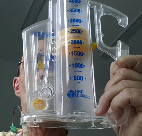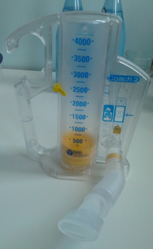Zur Vorbeugung von Lungenschäden habe ich hier ein kleines einfaches Spielzeug, das ich Euch heute mangels anderer weltbewegender Ereignisse vorstelle: Zweck ist, tief einzuatmen, so dass möglichst die ganze Lunge beschäftigt ist und somit vor Entzündungen bewahrt bleibt. Dazu atmet man über das Mundstück ein, und versucht, den kleinen Anzeiger möglichst lange im Smilie-Bereich zu halten und somit das große gelbe Ding im Kolben nach oben zu bringen. (Ist einfacher als es klingt.)