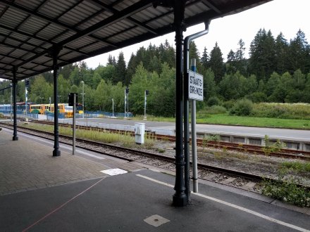 Hier gibt es keine Wartezeiten beim Grenzübertritt. So sollte es sein (Grenzbahnhof Bayerisch Eisenstein, wo früher der „Eiserne Vorhang“ mitten durch den Bahnhof ging)!