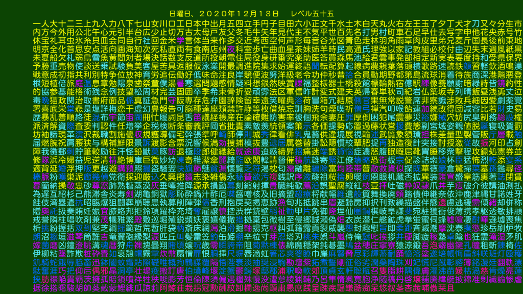 Meine restliche Tätigkeit bestand und besteht vor allem im fleißigen Japanisch-Lernen. Mittlerweile bin ich beim Kanji-Lernprogramm im Level 54 von 60 angekommen und habe bisher 1848 Schriftzeichen und 5876 Vokabeln kennengelernt. Voraussichtlich Mitte Februar werde ich das letzte Level erreichen. Leider heißt das noch nicht, dass ich japanische Texte problemlos lesen kann, geschweige denn Sprache verstehen oder selbst sprechen, dazu fehlen noch einige Vokabeln und vor allem weitere Grammatik-Kenntnisse. Lesen geht derzeit nur mit vielem Nachschlagen in Online-Wörterbüchern und mithilfe von Google Translate oder Deepl, das Sprachverständnis übe ich mit Filmen, Serien und Animes auf Netflix (mit englischen Untertiteln). Hier ist mein aktueller Kanji-Wissensstand (gelb heißt „gut abgehangen“, auch bei einer Abfrage nach 4 Monaten noch gewusst; je röter es wird, desto neuer oder öfter vergessen):